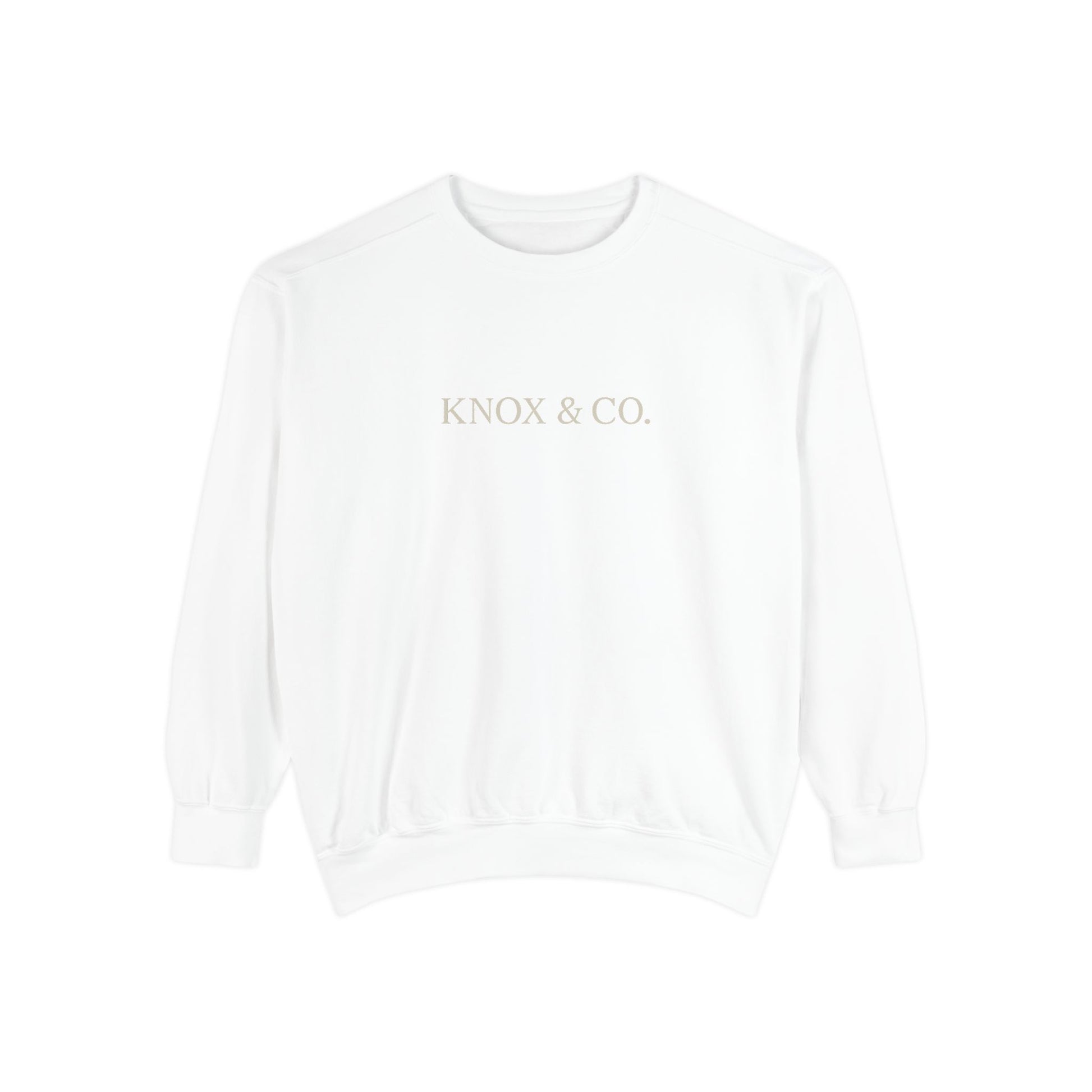 Crafted with ultra-soft, ring-spun cotton and garment-dyed for that lived-in feel from day one, this sweatshirt features our signature KNOX & CO. print in a subtle cream for timeless, understated style. It’s your new go-to—effortlessly elevated and rooted in home.