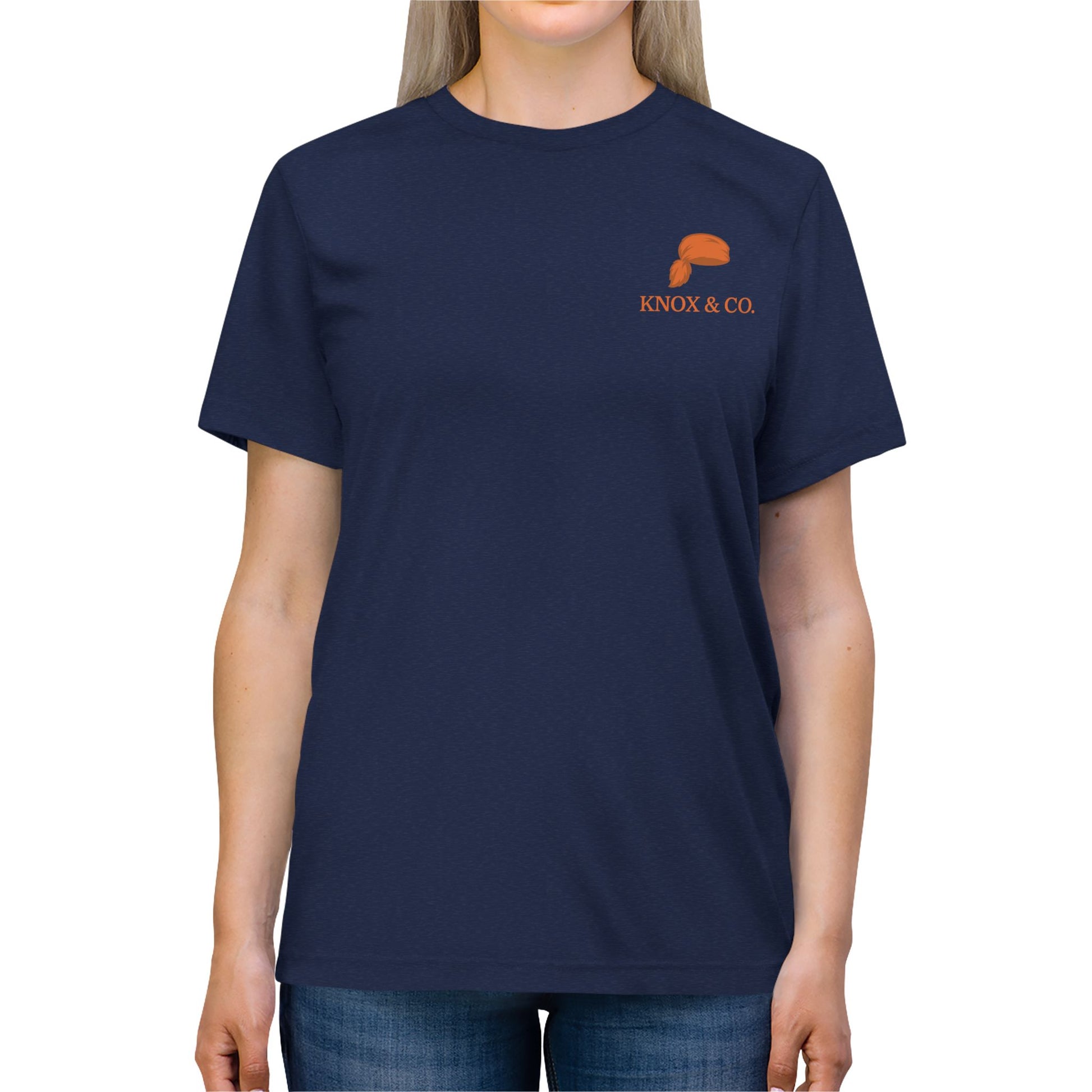 A quiet nod to Knoxville’s roots. Our signature coon-skin cap emblem, paired with the Knox & Co. wordmark, sits subtly on the chest of this ultra-soft tri-blend tee. Cut from a premium rayon-cotton-poly blend, it drapes with ease and feels lived-in from day one — the kind of shirt you’ll reach for long after game day.